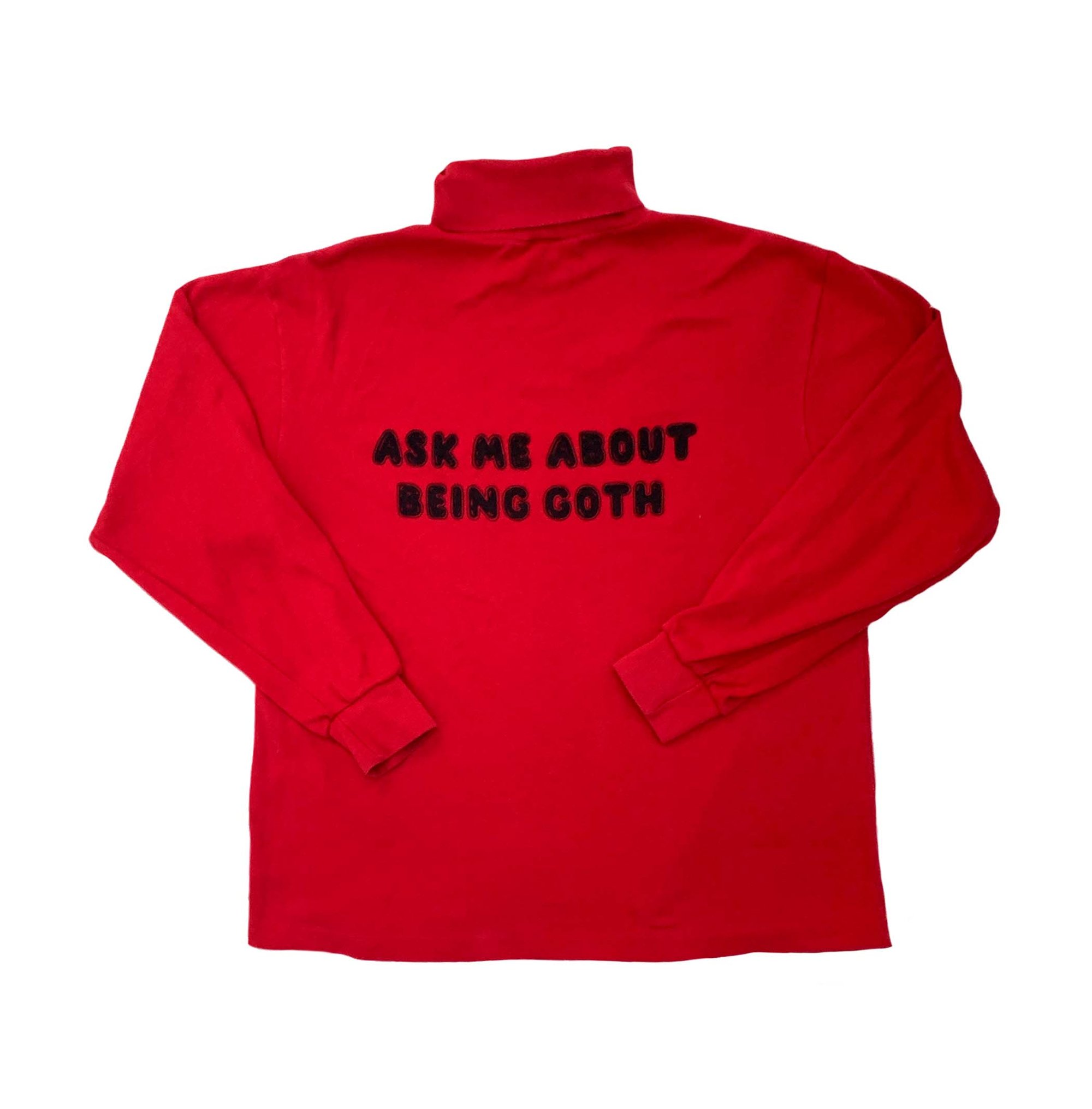upcycled screen-printed and rhinestoned turtleneck based on a cheeky 'how to be goth' manual i made for a typography class. the fit is unisex, but intended to be worn as an oversized medium. please see detailed measurements below :)